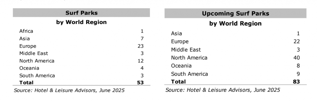 Since Hotel & Leisure Advisors’ first surf park study in 2008, the industry has seen rapid growth. 2025 is expected to be a record-breaking year, with seven new surf pools opening— the largest annual increase to date. Updated inventories and market analysis are necessary to reflect this evolving landscape. The following tables highlight the current inventory of open and planned surf parks around the world.