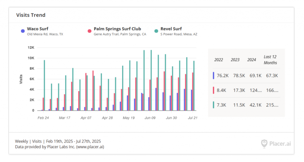 The buzz around surf parks is increasing, and the data indicates strong consumer interest. We analyzed Placer.ai data for the recently opened Palm Springs Surf Club in Palm Springs, California, as well as Revel Surf in Mesa, Arizona, and Waco Surf in Waco, Texas. Placer.ai is a location intelligence platform that uses aggregated mobile device location data to provide businesses with insights into visitation patterns, demographics, and other location-based data. Although Placer.ai data does not provide exact attendance and usage numbers, its cell phone tracking data offers reasonable estimates of how many people are visiting these properties, although it does not necessarily represent paid guests exclusively.
